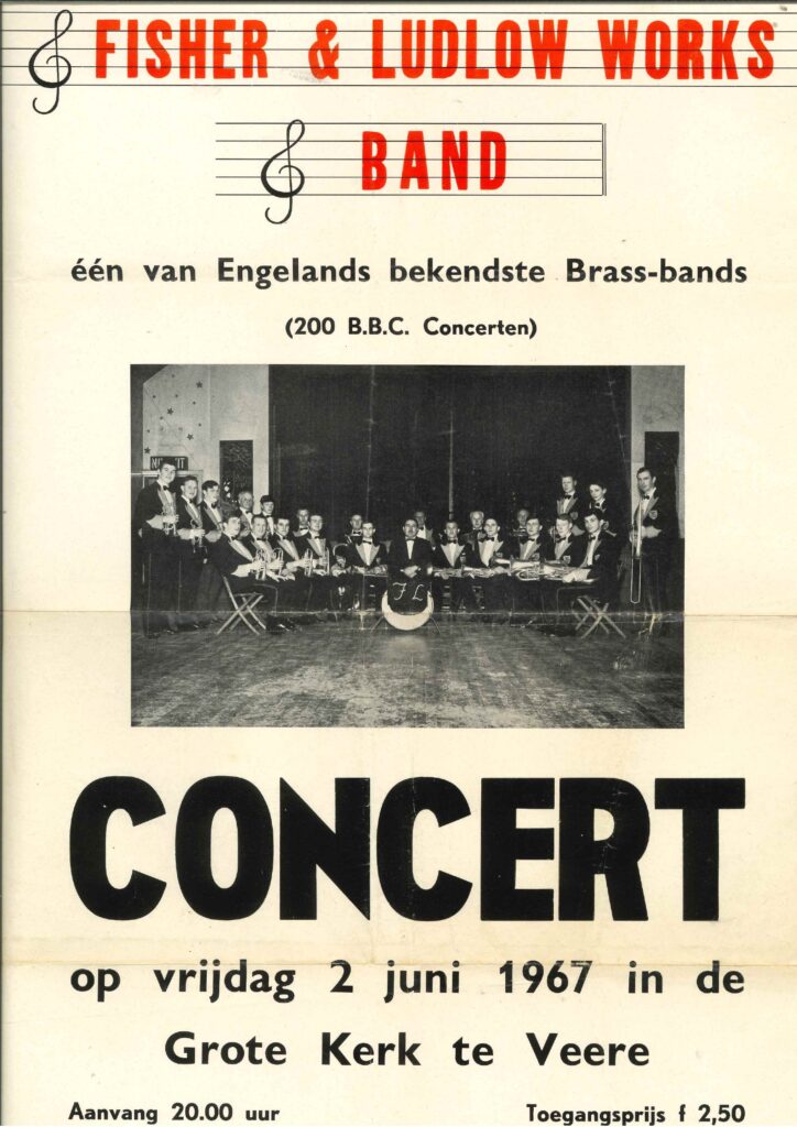 In 1967, the Fisher & Ludlow Works Band performed an international concert at the Grote Kerk in Veere, Netherlands, marking one of the band’s notable early overseas appearances.